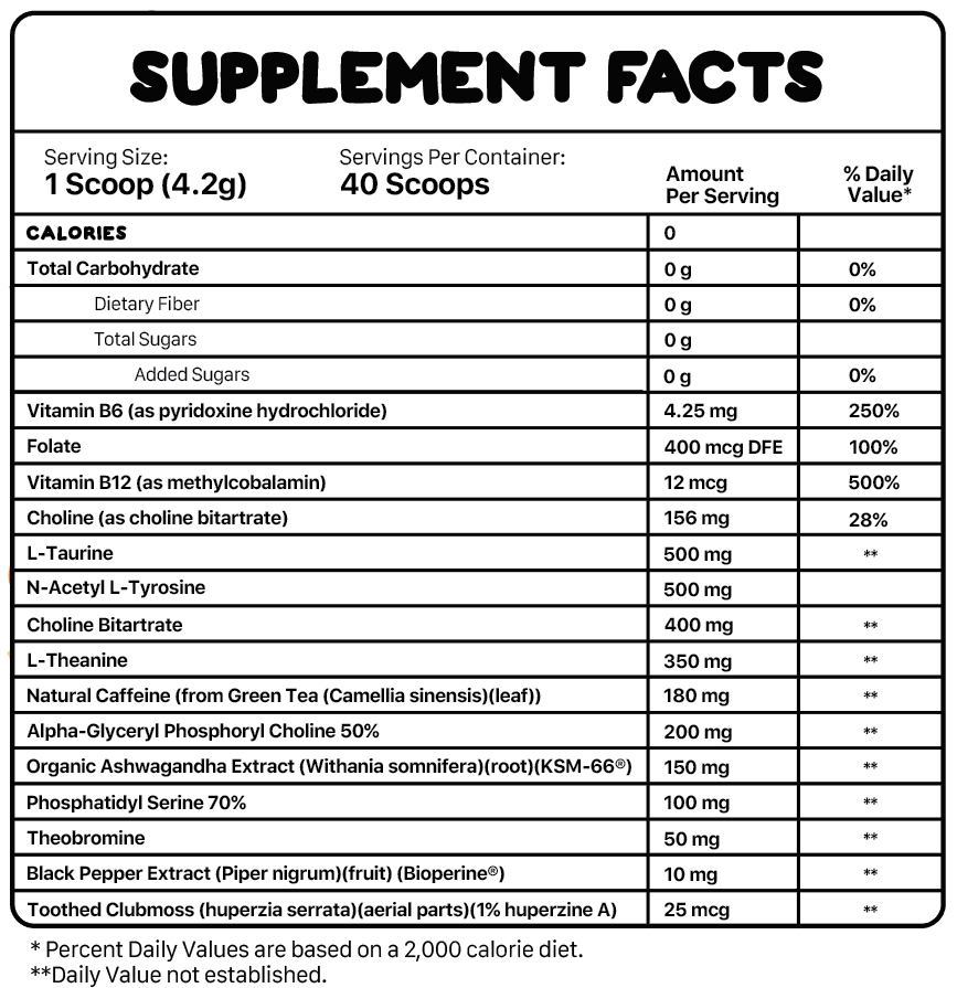 Ingredients: Vitamin B6 250%, Folate 100%, Choline 100%, L-Taurine, N-Acetyl L-Tyrosine, Choline Bitartrate, L-Theanine, Natural Caffeine (Green Tea Leaf), Alpha Glyceryl Phosphoryl Choline 50%, KSM-66®, Phosphatidyl Serine 70%, Theobromine, Black Pepper Extract(Biroperine®), Toothed Clubmoss (1% Huperzine A)